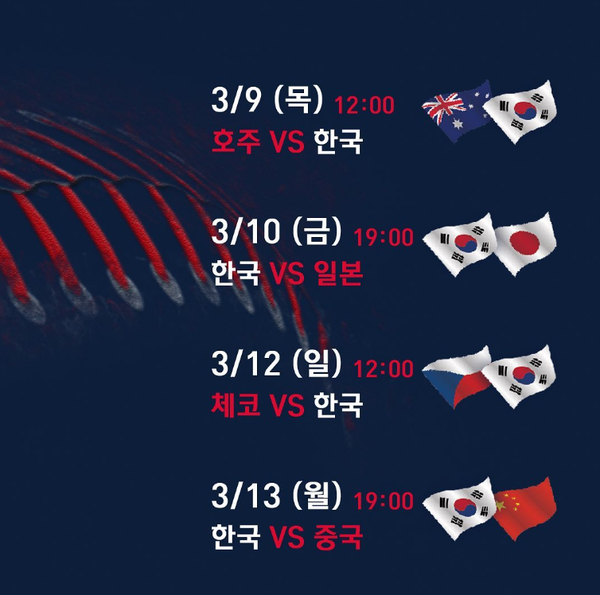 - 3월 13일 19:00 대한민국 VS 중국(중계 KBS2)