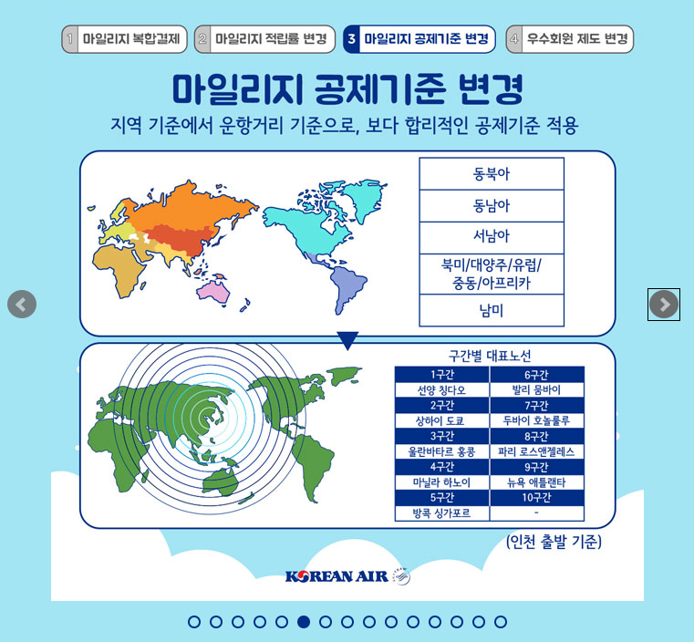 일등석과 비즈니스석은 기존에 비교해서 마일리지 적립률이 늘어나고, 일반석은 적립률이 유지되거나 줄어든다. 보너스 항공권이나 좌석 승급 시 국내·동북아·동남아·서남아·북미·남미 등 지역별로 적용되던 마일리지 공제 기준을 운항 거리 기준으로 변경합니다.