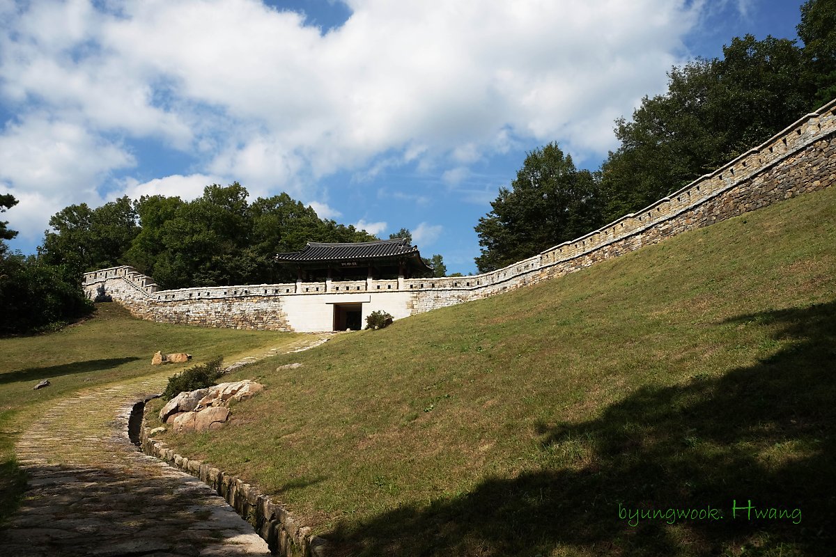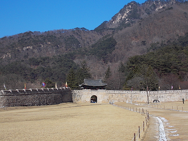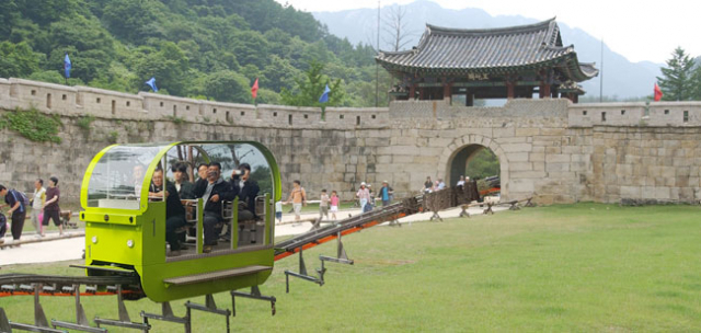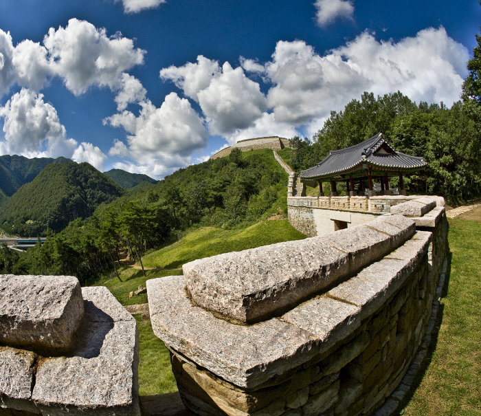 성황당은 마을 수호신이자 한양으로 오래전시험을 보러 가던 선비나 보부상이 쉬어가던 쉼터였고 지금은 초가집으로 주막촌이 복원돼 있어요. 성곽에 올라서면 고모산성의 진광경이 펼쳐져요. 푸른 산이 두른 가운데 진남교반 아래로 영강 물줄기, 탄광 철도가 한 폭의 그림과 같이 담겨 있어요.