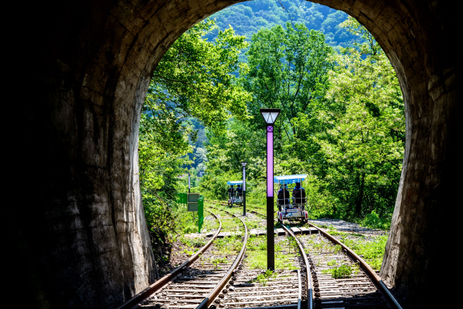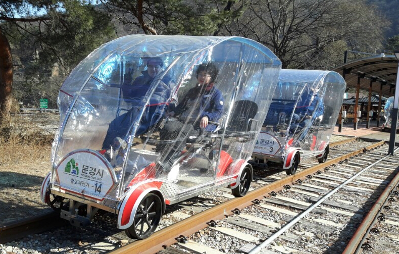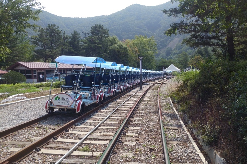 문경에서 1박 이상 하게 된다면 늦은 오후 해가 지고난 이후 이곳을 다녀가보시기 바래요. 문경의 철로 자전거는 다른 지역과는 차이나게 다리 위를 자전거로 이동할 수 있다는 장점이 있어요. 이곳을 지나면 바로 아래에 보이는 강가 광경도 내려다볼 수 있으며, 높이도 제법 있기 때문에 스릴도 느낄 수 있어요.