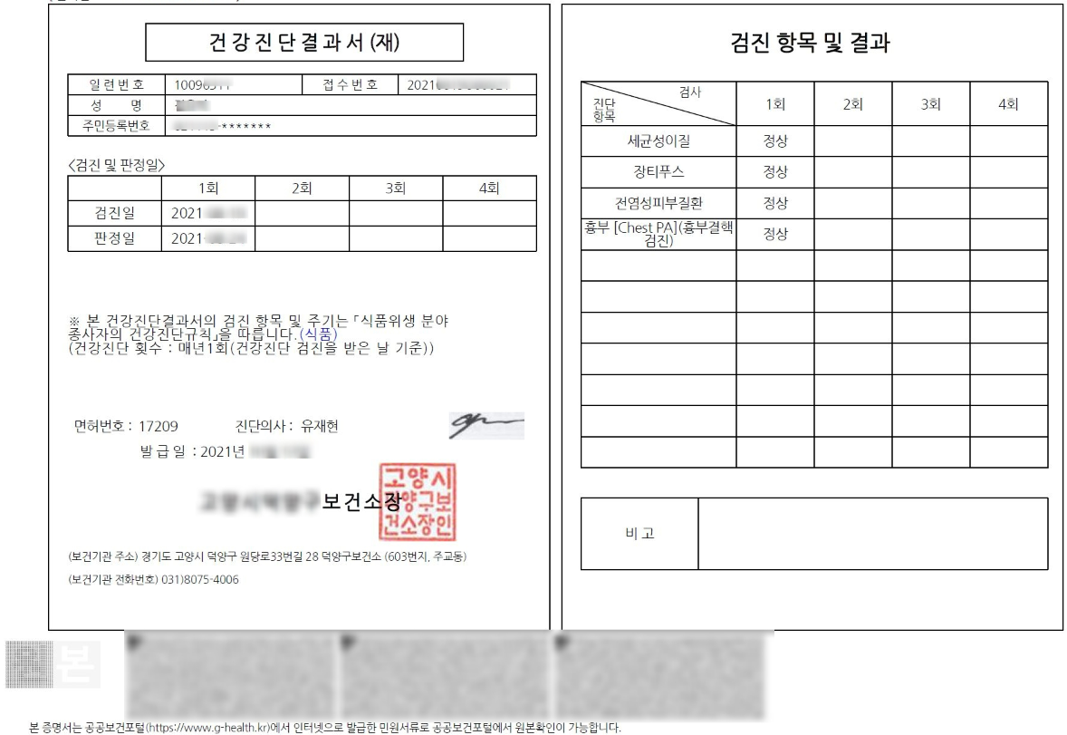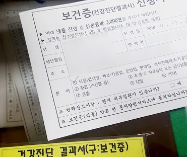 보건증은 건강진단결과서라고요. 식품 및 음식을 다루는 업종에서는 건강상 어떤 특별한 문제가 없다는 것을 입증하는 서류로서 식품의약품안전처, 복지부 등 연관 법령(식품위생법 제40조, 식품위생분야 종사자 등의 건강진단규칙 제2조)으로 정해져 있어 실시하는 것이라고요.