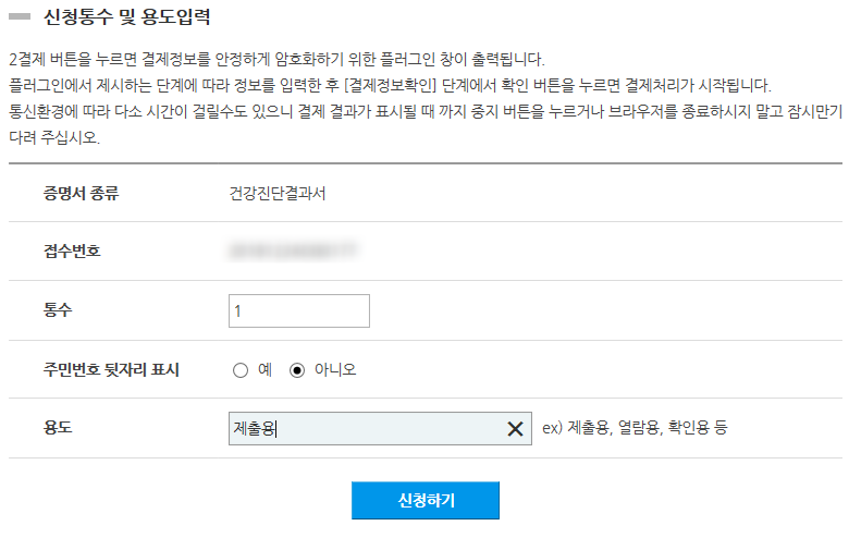 그러면 팝업창이 하나 뜨는데, 건강진단결과서(구 보건증)를 클릭하면, 접수일자, 보건소명, 접수번호가 보여집니다. 접수를 번호를 클릭해요. 발급용도, 신청통수, 주민등록번호 뒷자리 표기 가능성을 선택하며, 신청하기를 누르면 발급이 돼요.