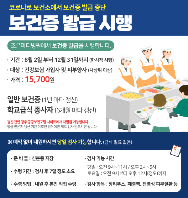 우선 각 지역 보건소를 내원하신 후, 신분증과 같이 신청서를 작성해 제출하신 후 검사를 하시면 몇 일 내(평균 5일 정도)로 검사 결과가 통보돼요. 검사에는 보건소 수수료 3,000원의 비용이 들어요. 일반 병원에서 발급하시는 경우는 1~3만원의 비용이 들어요. 그리고, 아직 코로나 여파로 보건증 발급 중단 후 재개가 안되거나, 보건증 발급 재개 후 예약시스템으로 운영되는 보건소가 많기 때문에 이점 반드시 체크하고 내원하시기 바래요. 당일 예약은 불최대한 경우가 많아요.