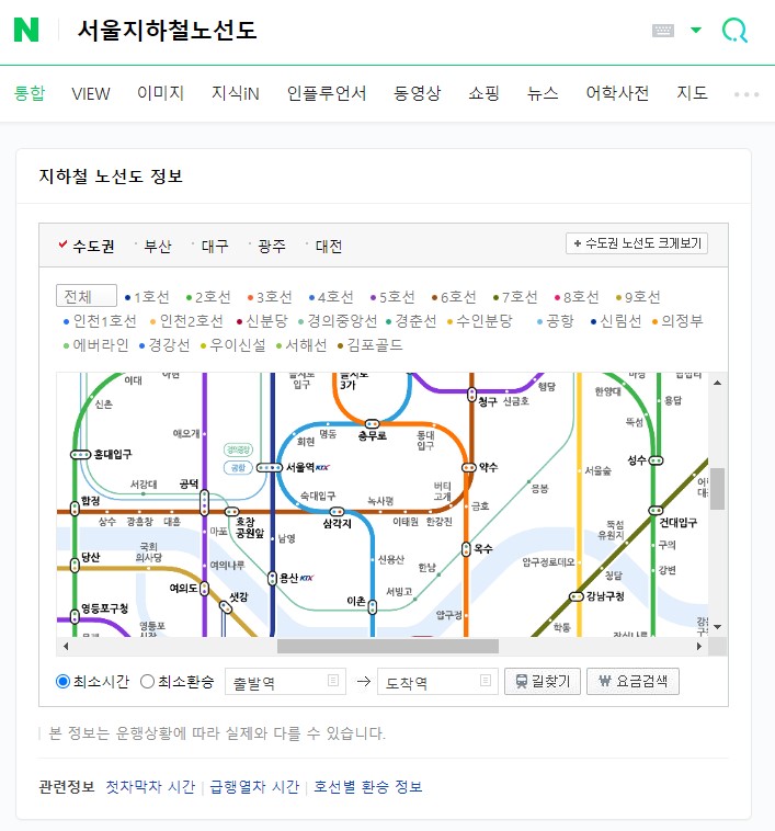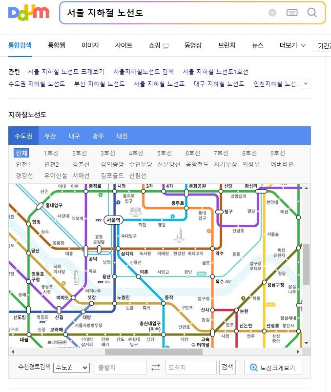 지하철 노선도는 다음이나 네이버에서 조회하게되면 기본적으로 호선별로, 경로별로 조회하도록 나타나고, 따로따로 노선별로 크게볼 수 있는 기능이 지원되고 있어요.
