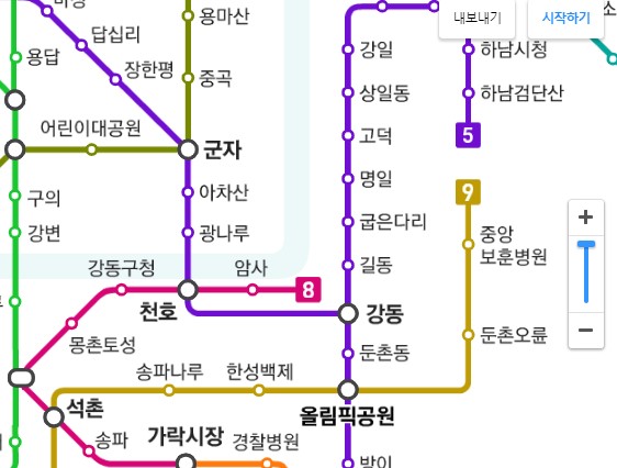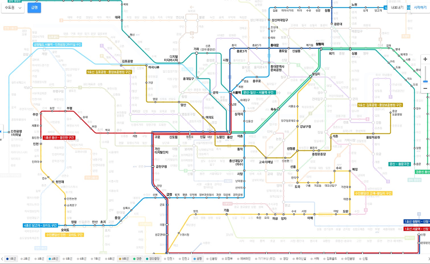 각 지하철 노선별로 색상을 지정해서 판별되어 있기 때문에, 노선을 클릭하게되면 선택한 노선만 표기되기으로 인해 알아보기 점점 쉽죠. 지금은 1호선부터 9호선, 거기에 공항철도와 수도권 외곽 지역 호선까지 총 23개 라인이 있기 때문에 복잡하므로 빠른 체크를 위하여는 노선을 선택하시는게 좋답니다.