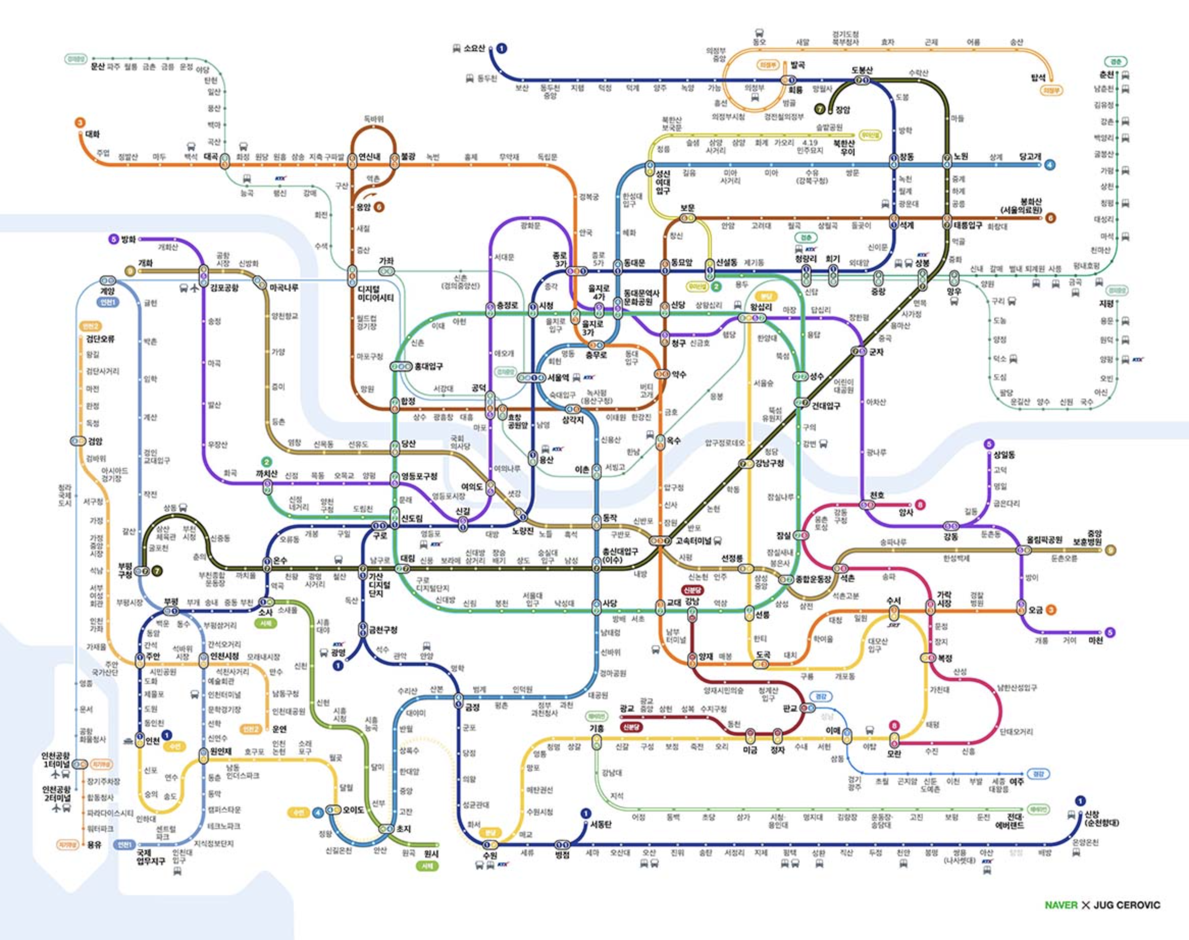 또한 지금은 경기도부터 가까운 충청도와 강원도 지역까지도 연결되어 있기 때문에 점점 편리해졌어요. 그만큼 서울과 수도권 지역 방방곡곡을 그물망과 같이 연결되어 있으므로 정차하는 역과 환승하는 역도 많아서, 최초 이용할 경우 전체 지하철 노선도를 한번에 알아보기에는 무리가 있을 수도 있다고 예상되는데요.