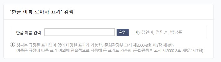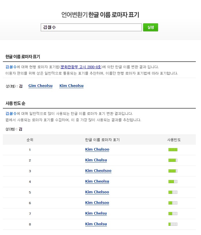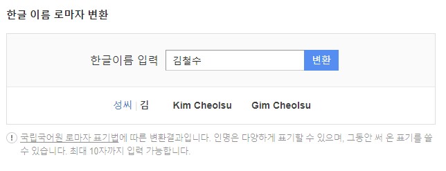 우리나라인들이 많이 활용하는 포털 서비스인 네이버인 만큼 유저들이 제일 많이 활용하는 표기법을 제시하는 것이 장점입니다. 으로 인해 내가 원하는 표기 방식을 고를 수 있다는 장점이 있습니다. 여기에 2글자 성씨도 번역해주고 있어 한글 이름 친화적인 서비스라 할 수 있습니다.