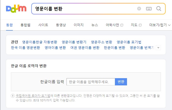 다음은 여러가지 기능을 전달하는 포털 사이트의 이름이라고 합니다. 조회 및 커뮤니티등의 기능을 공급하고 있습니다. 그리고, 몇가지의 계산기(예, 만나이 계산기 등)와 웹프로그램 기능도 공급해요. 해당 기능 중에는 '한글 이름 로마자 전환'에 연관된 기능도 있어요. 조회를 통해 찾을 수 있어요.