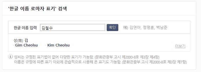 임의로 선택한 '김철진'이라 하는 이름의 영문표기법을 2가지 보여주고 있어요. [Kim Cheoljin / Gim Cheoljin]으로 표기되는 것을 찾아볼 수 있어요. 경우에 따라 더 많을 수도 있고, 하나만 표시될 수도 있어요. 그리고, '국립국어원 로마자 표기법'에 대한 데이터를 바로 찾아볼 수 있는 기능도 마련되어 있어요.