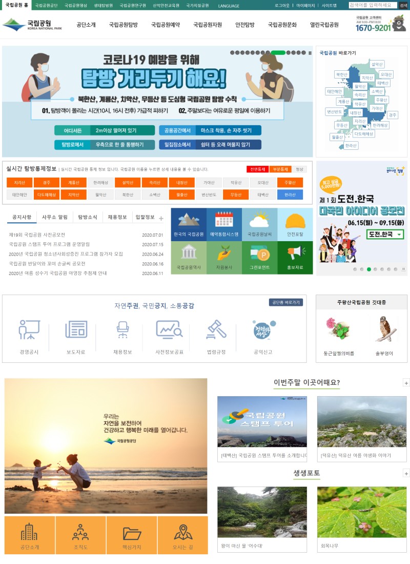 국립공원 관리공단은 우리나라의 동식물종의 70퍼센트 이상이 서식하는 국립공원에서는 자연환경에 대한 갖가지 자연체험프로그램, 가족단위 생태관광, 탐방 프로그램, 야영장, 민박촌 등 가지가지 프로그램과 시설을 운영하고 있습니다.