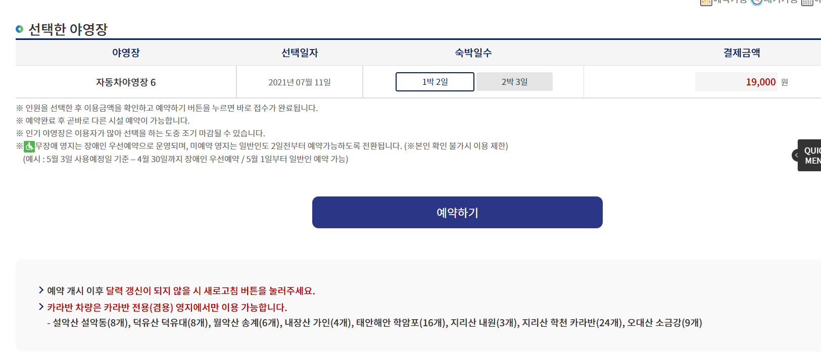 예약가능날짜를 클릭하시면 선택한 야영장의 데이터를 체크하실 수 있고요. 선택일자, 숙박일수, 결제가격이 보이실텐데 숙박일수는 1박 2일, 2박 3일 중에서 선택하실 수 있습니다. 선택하고 예약하는걸 누르면 완료입니다.