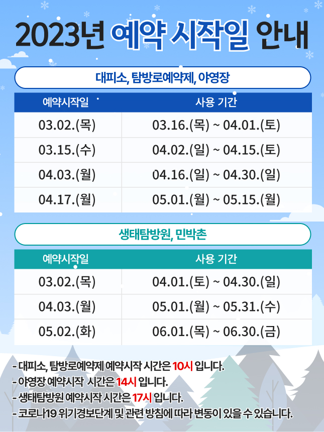 국립공원관리공단 예약통합시스템에서는 봄, 여름, 가을 성수기에 대개 탐방객에게 균등한 시설 이용 기회를 내놓기 위한서 추첨제를 실시하고으며, 성수기에 조기 마감되는 사전 선착순 예약제 운영 방식을 보충해, 국민대표가 무작위로 이용객을 뽑습니다. 세부 일정은 매해 살짝씩 바뀔 수 있기 때문에 예약통합시스템 공지를 통해 체크해야하고요.
