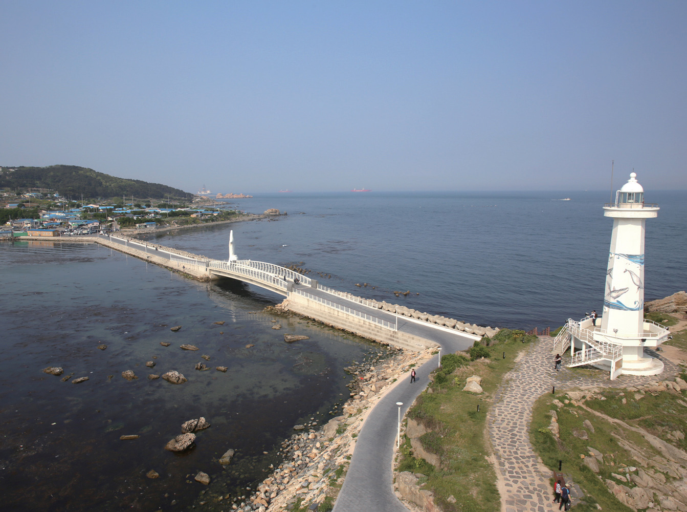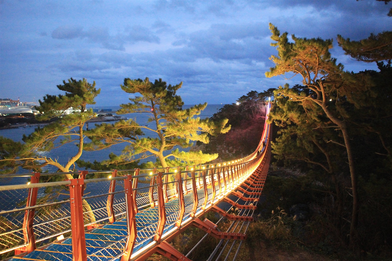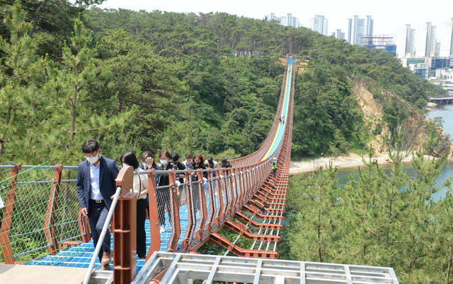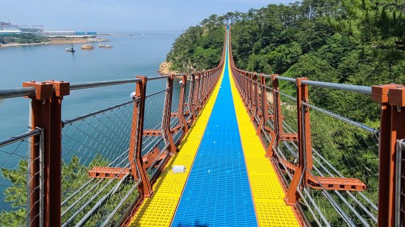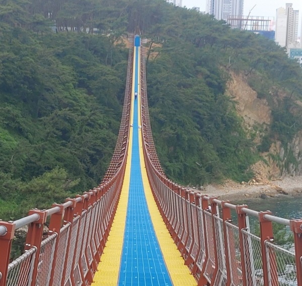 현재 전국의 출렁다리 중 기둥과 기둥 사이의 길이가 가장 긴 대왕암공원 출렁다리는 조선업 불황 극복을 위해 동구의 연안에 조성 중인 꽃바위 바닷소리 길 등과 더불어 형성시켜진 장소로 바다 위로 이어진 다리이니까 대왕암 부근의 해안 비경을 짜릿하게 만끽할 수 있는 곳이예요.