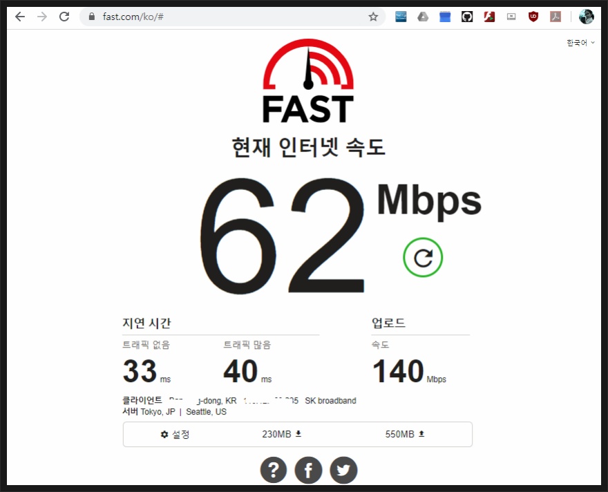 넷플릿스에서 전달하는 인터넷 속도 사이트이라고 합니다. 좋은 점은 웹사이트에 들어가자마자 속도측정을 해요. 속도 측정을 가장 빠르고 직관적으로 할 수 있기 때문에 인터넷이 정말 심각하게 느릴 때 쓰면 좋답니다. 상세보기를 하게되면 업로드 속도와 트래픽을 알 수 있어요. 현재 ip와 가입된 통신사도 알 수 있어요.