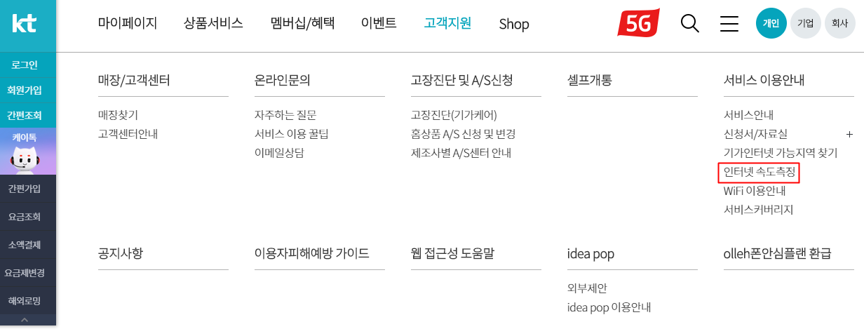 KT 홈페이지 상단에 고객지원 부분을 클릭해서 품질 체크 및 A/S신청하기 항목에서 인터넷 속도 측정을 선택해요. 고객지원 → 품질 체크 및 A/S 신청하기 → 인터넷 속도 측정을 순서대로 선택해요. 속도 테스트 화면이 나오면, 인터넷 내역 체크 후에 진행하시면 돼요.